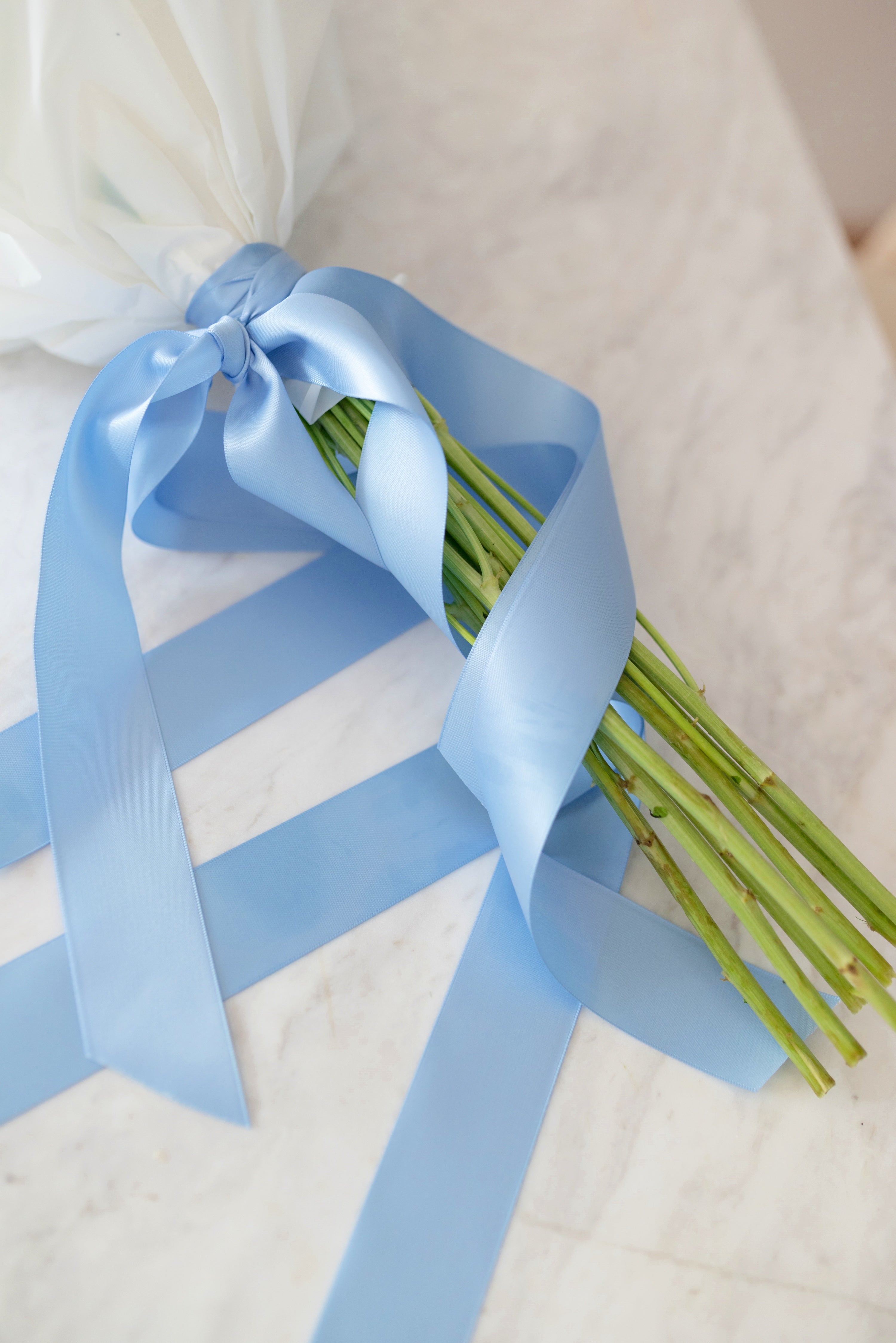 The bouquet consists of chamomile wrapped in paper and a satin ribbon.