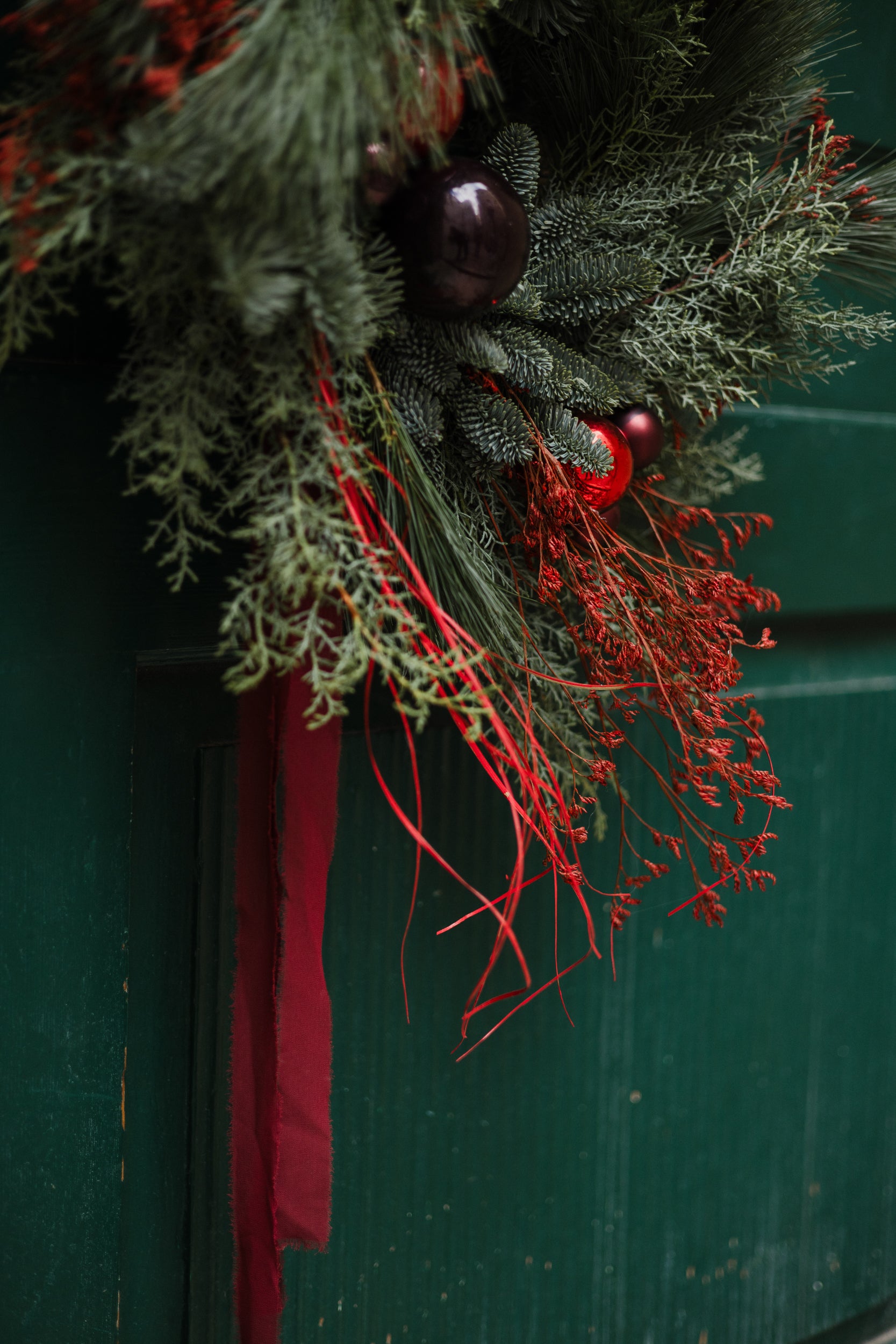 VIJENAC OD ZIMZELENOG BILJA SA CRVENIM DETALJIMA - BOŽIĆNA DEKORACIJA